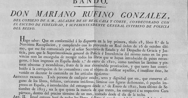 Bando de don Mariano Rufino González, del Consejo de S.M. Alcalde de su Real Casa y Corte, Condecorado con el Escudo de Fidelidad, y Superintendente General Interno de Policía del Reino. Madrid, 14 de noviembre de 1824. URL: http://bvpb.mcu.es/es/catalogo_imagenes/grupo.cmd?posicion=2&path=34558&presentacion=pagina